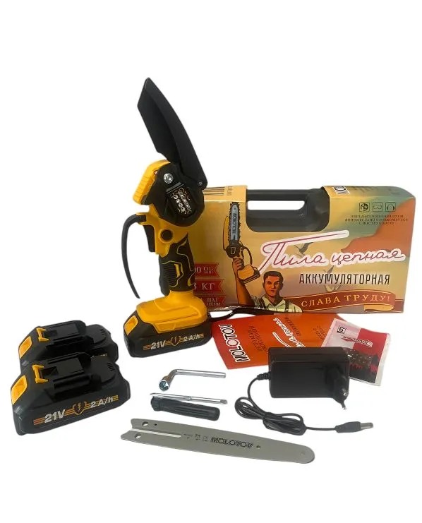 Пила аккумуляторная цепная мини Molotov MCC21BL-2 Модель имеет эргономичный дизайн, укомплектована необходимым инструментом и комплектующими. Данная пила MOLOTOV специально разработана для работы в саду при уходе за растущими деревьями и работ в кроне дерева, распила и обрезания веток деревьев, проведения работ по заготовке деревянных заготовок в соответствии с допустимой длиной резания. Работа с пилой MOLOTOV может осуществляться только с материалами из дерева, при работе с другими материалами возможно повреждение пильной гарнитуры. Повреждения пильной гарнитуры не является гарантийным случаем. Данная аккумуляторная цепная пила не предназначена для работ по валке деревьев и заготовке дров. Для этого вида работ необходимо использовать более мощные цепные пилы.